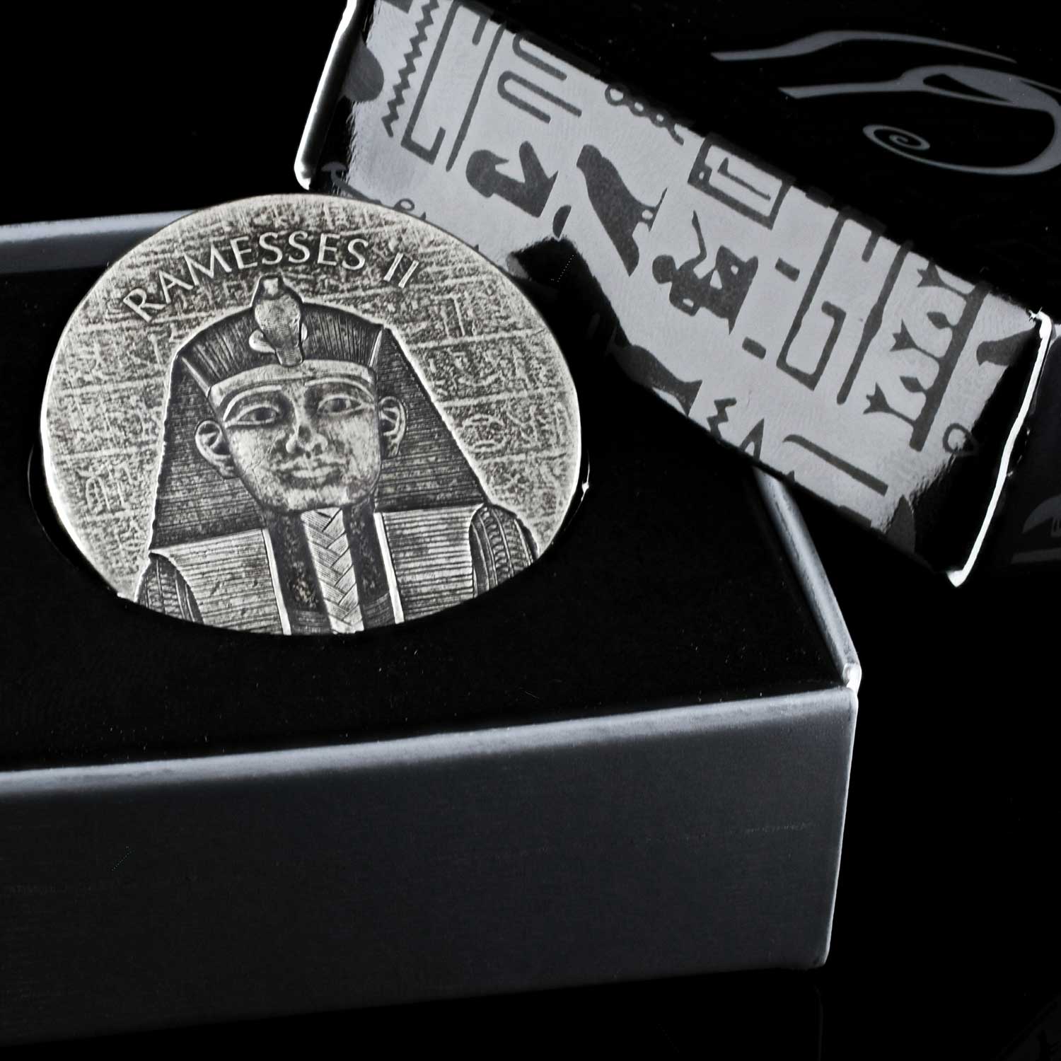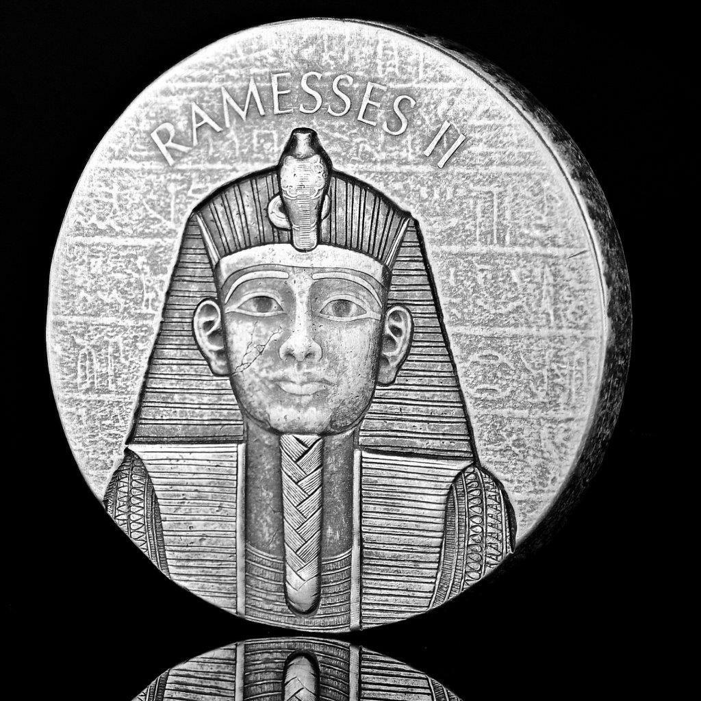 Moneda con estuche y certificado. Acabado especial Antique Finish, con un diseño basado en los jeroglíficos del Antiguo Egipto y un borde que se asemeja al granito cincelado. Ramsés II es sin duda alguna el más impresionante y recordado de todos los antiguos faraones. Reinando incluso durante más tiempo del que la reina Isabel II ha estado en el trono británico, dejó un conjunto de monumentos y arquitectura sin precedentes.