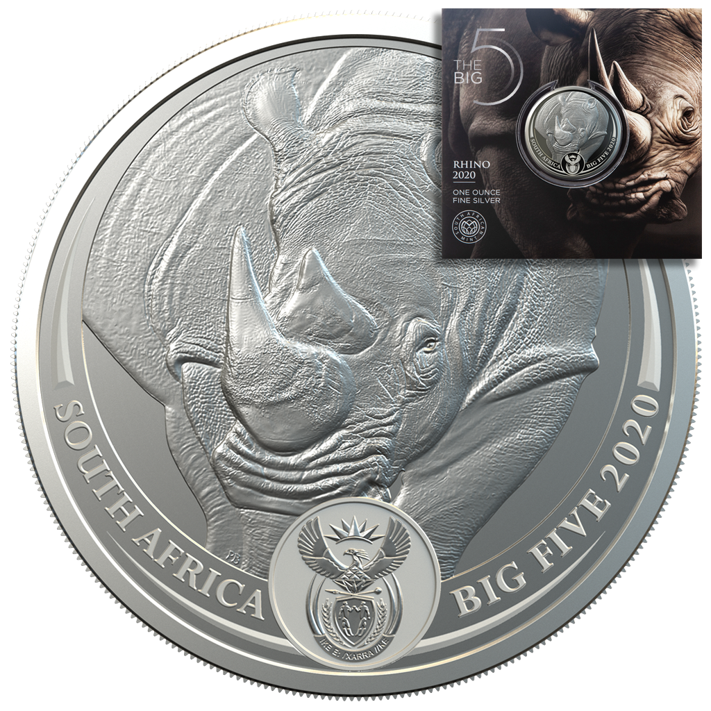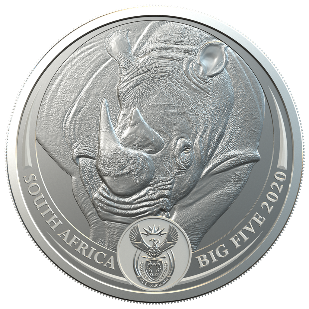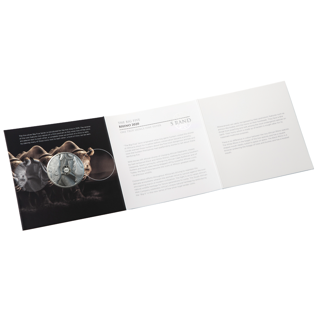 Los animales conocidos como "Cinco Grandes" - Elefante - León - Búfalo - Rinoceronte - Leopardo - son hitos y embajadores de este país de gran riqueza cultural. El motivo de la moneda de plata presenta el impresionante retrato de un rinoceronte. El reverso de la moneda representa dos mitades de una cabeza de rinoceronte. Cuando dos de las monedas se colocan una al lado de la otra, se puede ver un retrato completo en primer plano de un rinoceronte. Al colocar muchas de estas monedas una al lado de la otra, se puede ver una manada completa de rinocerontes. La moneda se entrega sellada en una tarjeta blister ilustrada.