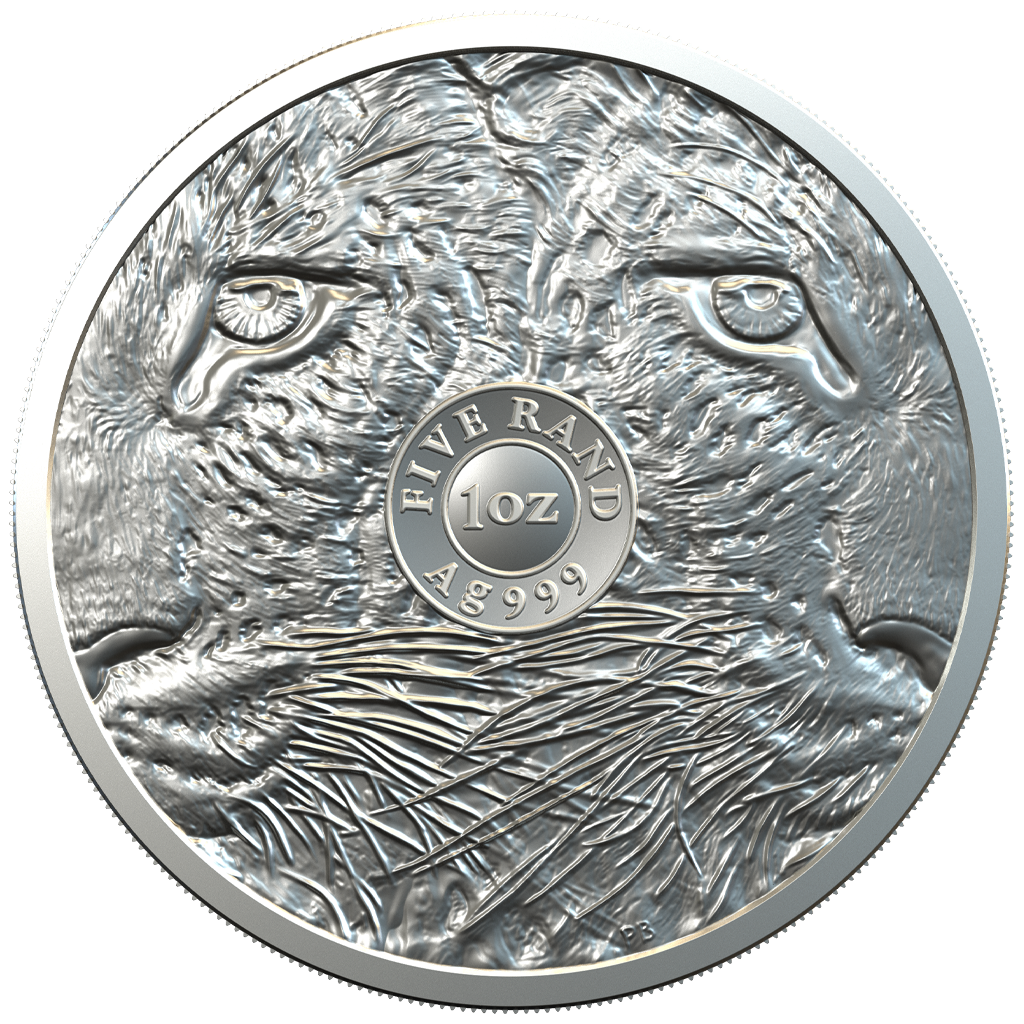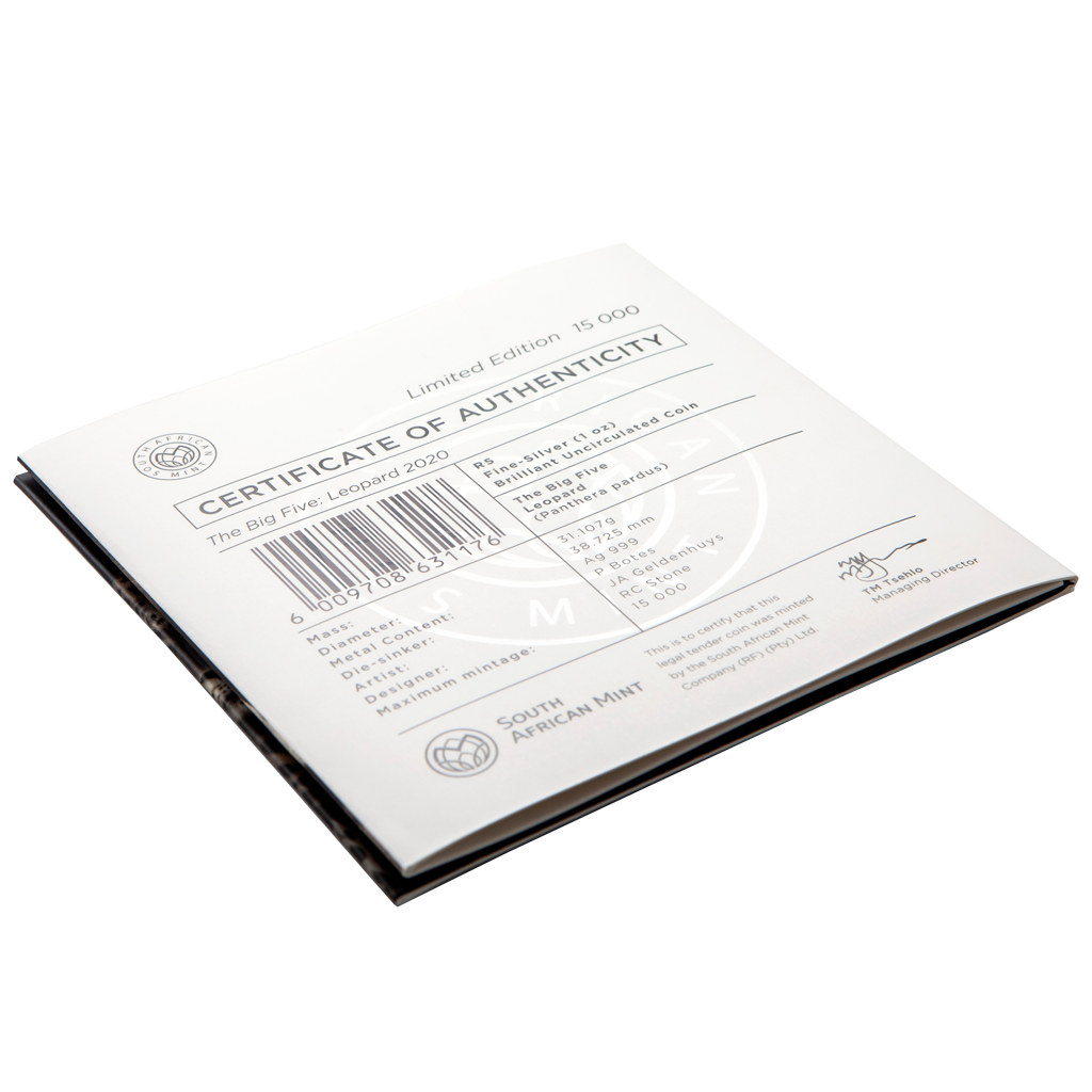 El motivo de la moneda de plata presenta el impresionante retrato de un leopardo. También se incluyen en el diseño las inscripciones "Sudáfrica", "Cinco Grandes 2020" y el escudo de armas nacional de Sudáfrica. El reverso presenta dos mitades de una cabeza de leopardo. Cuando dos de esas monedas se colocan una al lado de la otra, se ve un retrato completo en primer plano de un leopardo. Al colocar muchas de estas monedas una al lado de la otra, se puede ver una manada completa de leopardos. Junto con el león, el tigre y el jaguar, el leopardo es uno de los grandes felinos más elegantes y poderosos. Como un verdadero artista de supervivencia, el ágil cazador se puede encontrar en los bosques primitivos del continente, así como en montañas, sabanas y semidesiertos.