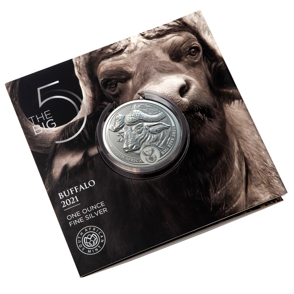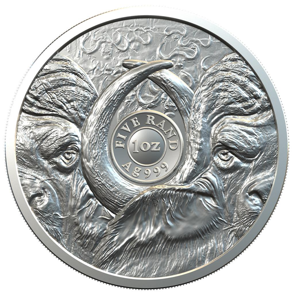 El búfalo del Cabo o africano (Syncerus caffer) es un pastoreador típico. Vive en manadas de unas pocas docenas a cientos de animales y prefiere áreas pantanosas y pastizales sombreados cerca del agua. Particularmente característico del búfalo son sus cuernos amplios y curvos, que pueden alcanzar una envergadura de hasta 1,50 metros. Como miembro de los "Cinco Grandes", el búfalo fue cazado anteriormente en la caza mayor y diezmado severamente, por lo que la especie casi se extinguió; mientras tanto, sin embargo, las poblaciones se han recuperado. El reverso presenta dos mitades de una cabeza de búfalo. Cuando dos de esas monedas se colocan una al lado de la otra, se ve un retrato completo en primer plano de un búfalo. Al colocar muchas de estas monedas una al lado de la otra, aparece toda una manada de búfalos.