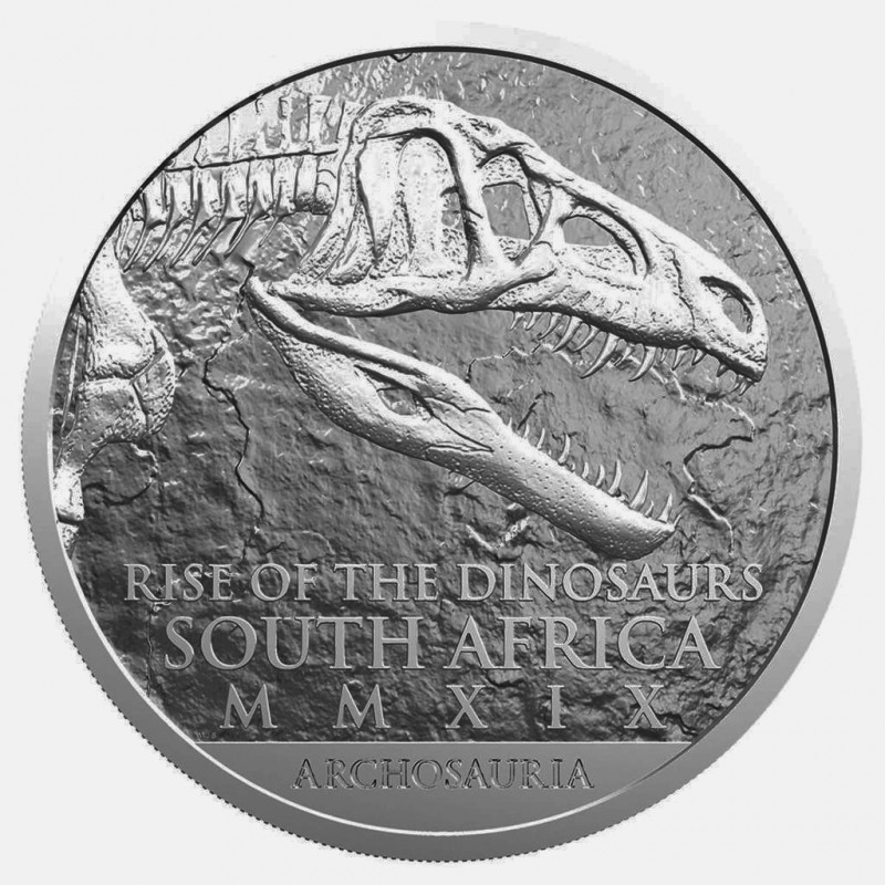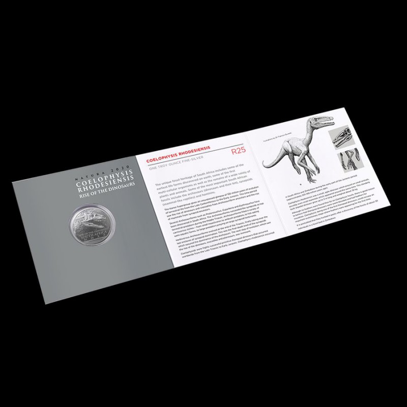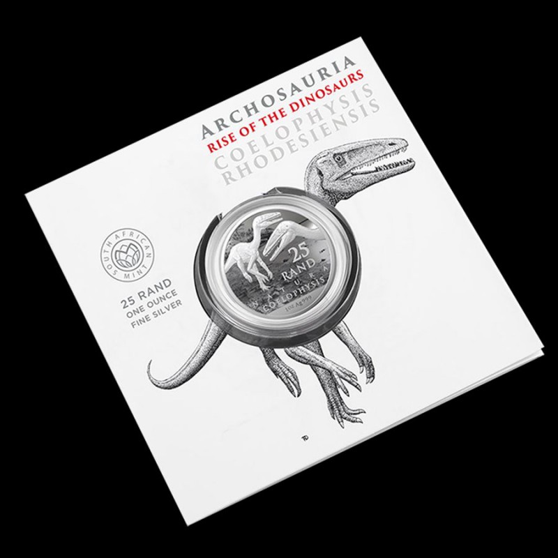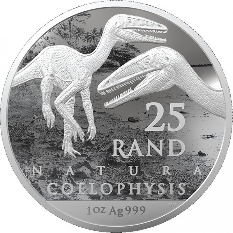 Segundo número de la serie Natura 'Paleontología - Rise of the Dinosaurs' de la Casa de la Moneda de Sudáfrica está dedicado a Coelophysis Rhodesiensis . En reconocimiento a la importancia de Sudáfrica para el campo de la paleontología y el estudio de fósiles de plantas y animales, en 2019 la Casa de la Moneda de Sudáfrica acuñó la primera moneda de plata Natura.. Los archosaurios vivieron en el sur de África hace más de 200 millones de años y son considerados los antepasados directos de los dinosaurios. El surgimiento de los arcosaurios y su evolución es un hecho significativo en la historia de la vida en la tierra, ya que no solo llevaron a la evolución de los dinosaurios y las aves, sino también a los pterosaurios (reptiles voladores) y los cocodrilos.