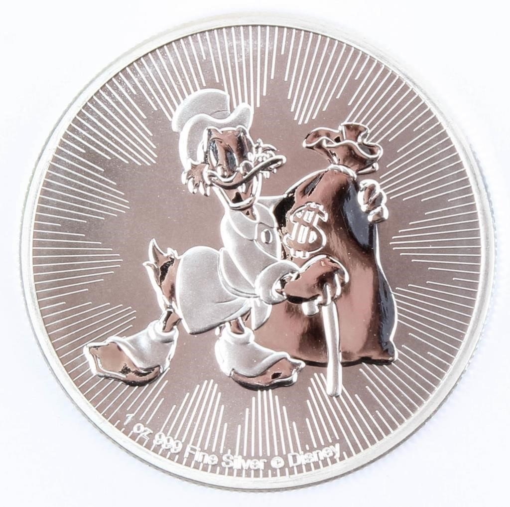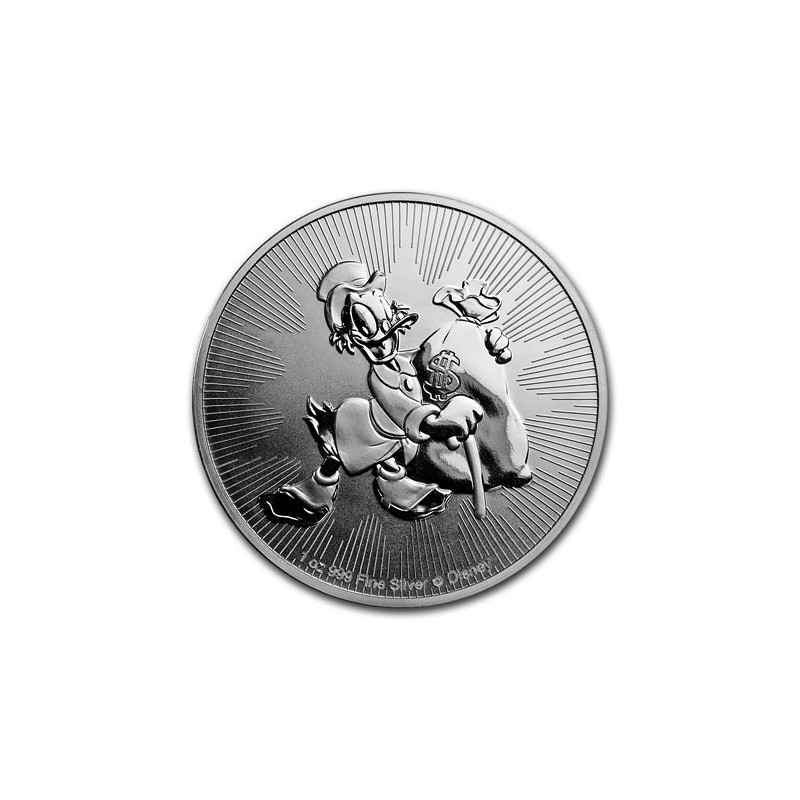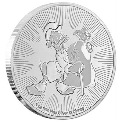 Moneda de plata con la imagen del popular tío rico Scrooge McDuck ™ del Pato Donald™, con una bolsa de dinero. El diseño incluye el peso del metal, la pureza y los derechos de autor de Disney ™ para brindar mayor autenticidad. El anverso de la moneda de plata de 2 dólares sin circular muestra la efigie de Ian Rank-Broadley de Su Majestad la Reina Isabel II.