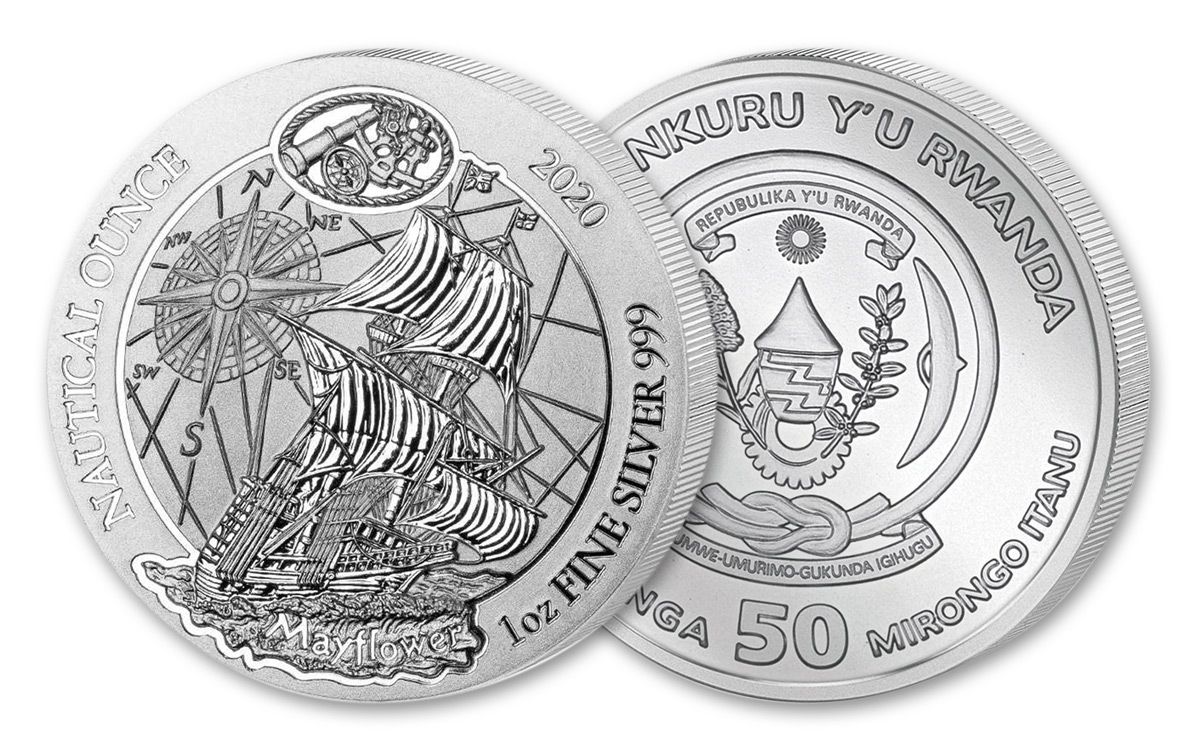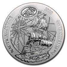 El anverso representa el Mayflower en vela con una brújula estilizada en el fondo. Las inscripciones "Onza Náutica", "2020", instrumentos náuticos y la pureza se enumeran a lo largo del borde.
