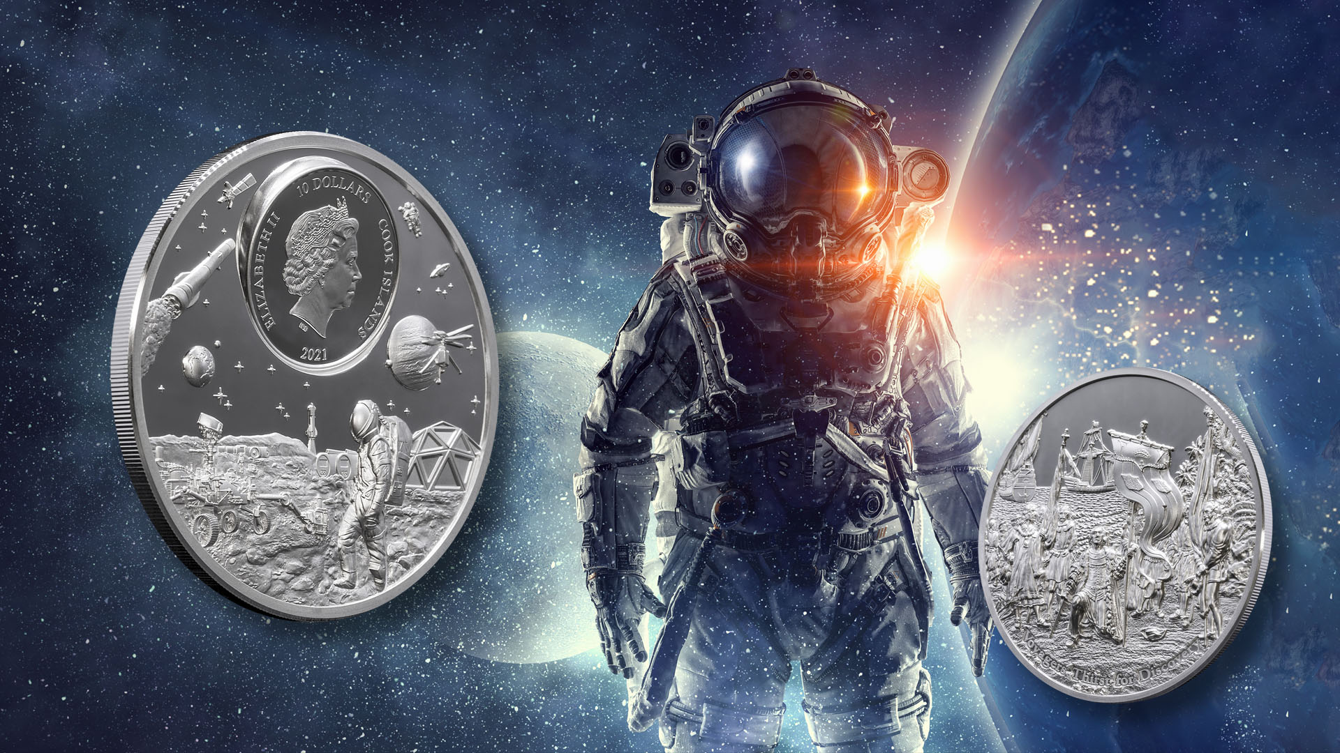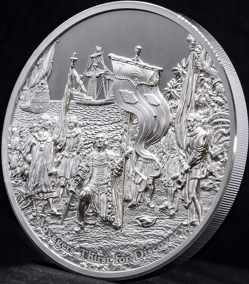 Primer lanzamiento de la serie "Time Flies", dedicada a la Exploración. La moneda presenta la tecnología Smartminting, tiene una calidad Proof y se entrega en una hermosa caja, junto con el Certificado de Autenticidad. Tirada limitada a solo 333 piezas en todo el mundo. El reverso de la moneda muestra la hermosa imagen de Colón con tres barcos, que tocó tierra en las Américas el 12 de octubre. Su lugar de desembarco fue una isla en las Bahamas, conocida por sus habitantes nativos como Guanahani. En la parte inferior del reverso, la inscripción: "Voyagers Thirst for Discovery" - el nombre de la moneda. El anverso de la moneda representa la efigie de Su Majestad la Reina Isabel II, rodeada de elementos conectados al espacio, sondas, naves espaciales y un astronauta, con las inscripciones: "ELIZABETH II" - el nombre de la Reina. Representa la exploración y el asentamiento de vuelos espaciales tripulados por humanos a Marte, el cuarto planeta del Sistema Solar en nuestro futuro