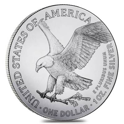 El nuevo diseño original de 2021 presenta un águila calva en el reverso. El águila se muestra en pleno vuelo con las alas extendidas, agarrando una gran rama de roble entre sus garras. El realismo del detalle del águila es increíblemente realista, rompiendo con la tradición de las representaciones heráldicas del águila calva en las monedas estadounidenses anteriores. Alrededor del borde exterior, están inscritos el país emisor ("ESTADOS UNIDOS DE AMÉRICA"), la denominación ("UN DÓLAR"), la composición ("1 OZ. PLATA FINA") y el lema "E PLURIBUS UNUM".