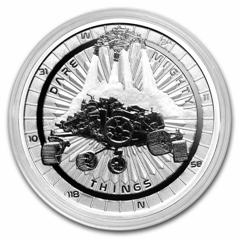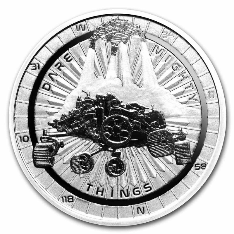 El anverso es una imagen del rover amartizando en la superficie con la ayuda de la etapa descendiente propulsada por cohetes. Esta etapa fue diseñada para contrarrestar la atracción gravitacional del amartizaje mediante la creación de una fuerza ascendente mediante la propulsión a chorro. Alrededor del rover hay una imagen estilizada del paracaídas, que también ayudó en el amertizaje. El paracaídas es único porque contenía un código que luego fue descifrado por los usuarios de Internet. Las palabras "Dare Mighty Things" (" ATRÉVASE A COSAS PODEROSAS"), así como las coordenadas del laboratorio donde se diseñó el rover, se ven en el paracaídas y la moneda. El reverso presenta un clic establecido en el momento en que recibimos la confirmación del amertizaje. También presenta símbolos del desarrollo de la vida en la Tierra, que, como el paracaídas, se incluyeron secretamente en la misión. Estos se incluyen alrededor del borde de la cámara en el propio rover.