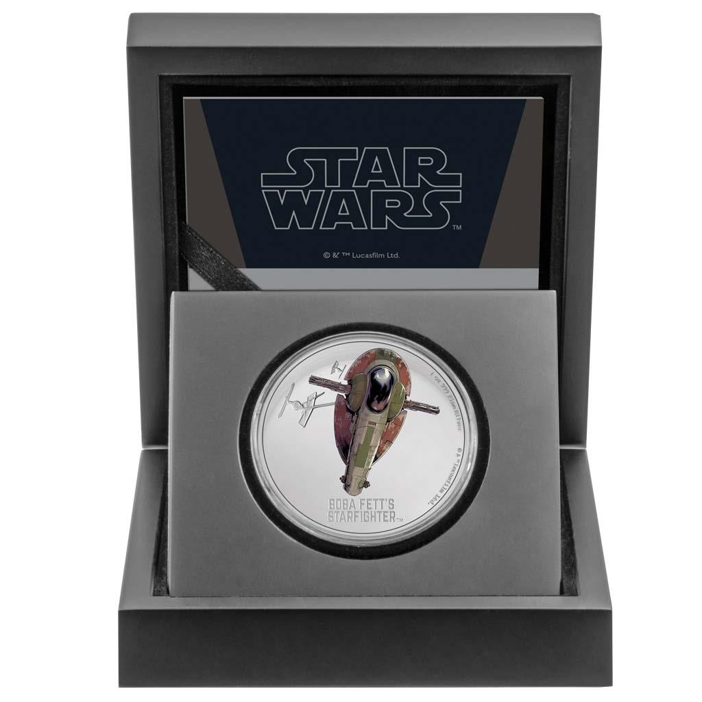La moneda de STAR WARS ™, representa al Starfighter ™ en primer plano, huyendo de dos TIE Fighters ™. Con la ayuda del fondo minimalista y un fino relieve, las tres naves, especialmente el colorido Starfighter ™, están hábilmente colocadas en escena. Creando un realista diseño. El mismo se completa con la inscripción "BOBA FETT'S STARFIGHTER ™" y los detalles sobre el peso y la finura de la moneda.