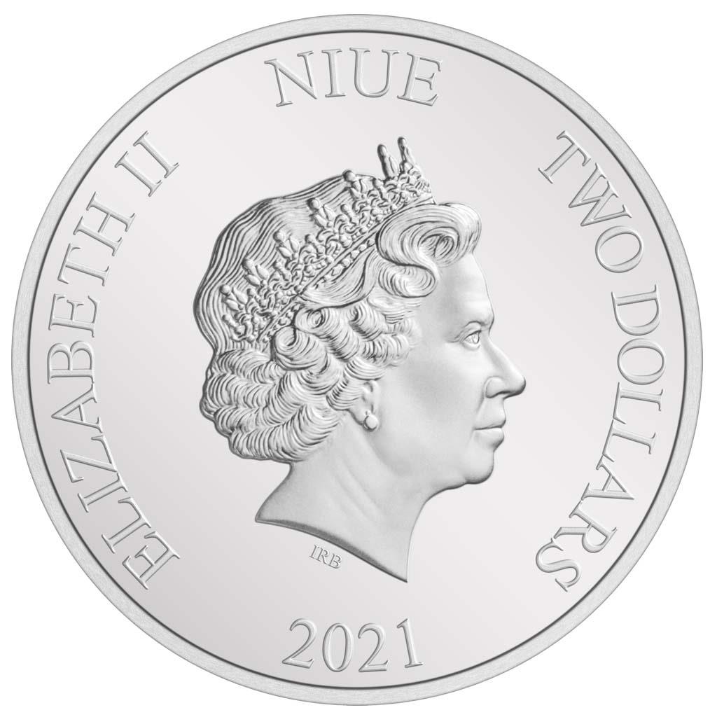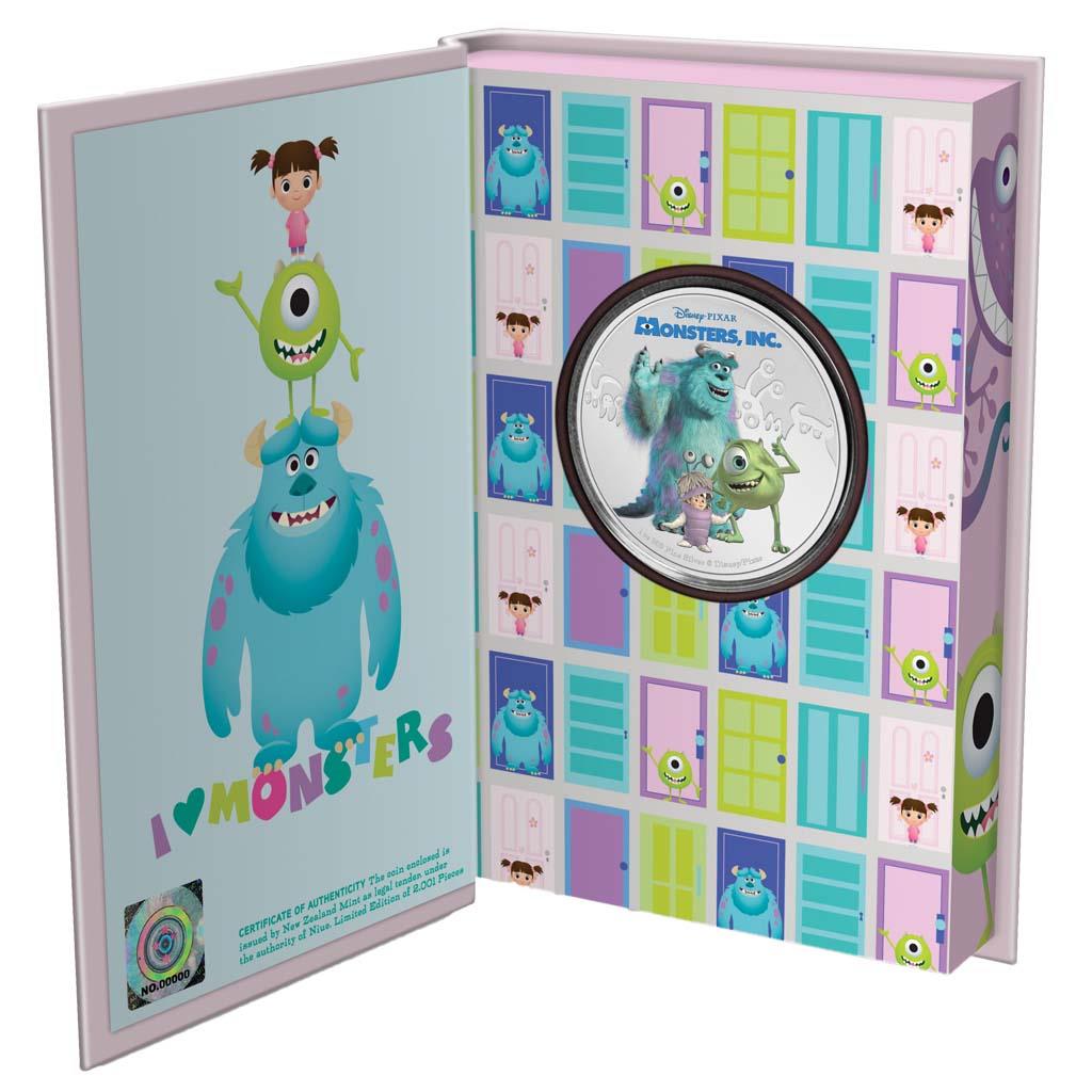 20 Aniversario de la película. La moneda representa a los tres personajes principales de la exitosa película animada, que se estrenó el 2 de noviembre de 2001: los dos monstruos James P. Sullivan y Mike Wazowski y el niño humano "Boo ". En el fondo, se insinúan vagamente otros monstruos.
